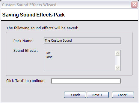 can review the sound effects that will be saved. Click 'Next' to continue.