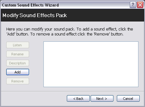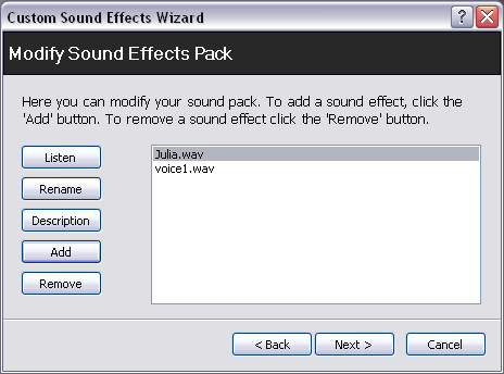 효과음 목록: '추가'버튼을 클릭해 목록에 효과음을 추가하십시오. 16비트 무손실 웨이브 (*.wav) 음성을 추가할 수 있습니다. 음성의 최대 길이가 10초 이내여야 한다는 것도 알아 두십시오.