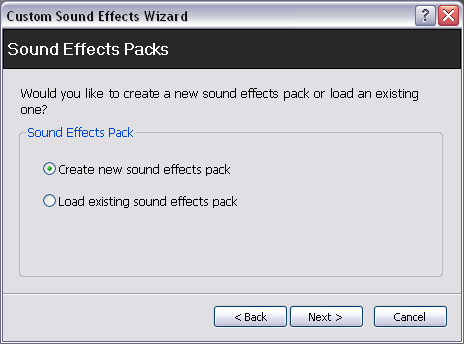 효과음 팩: 이 페이지는 이미 효과음 팩을 생성하신 경우에만 나타납니다. 여기서 새 효과음 팩을 만들거나 이미 존재하는 팩을 불러올 수 있습니다. '다음'을 눌러 계속하십시오.