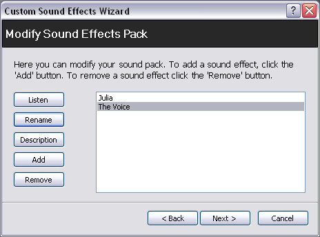 효과음 다루기: 효과음을 추가하고 나면, '듣기' 버튼을 클릭해 효과음을 들어 볼 수 있습니다. '이름 바꾸기' 버튼을 클릭해 효과음의 이름을 바꾸시고 '지우기' 버튼을 클릭해 효과음을 지우십시오.