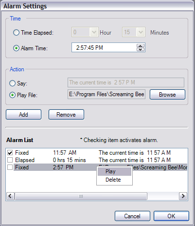 * Elapsed alarms that are checked, will start counting down after closing the dialog with OK.