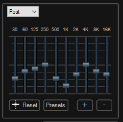 1. Graphical Equalizer: Adjusts the sound envelope of your voice. It consists of a series of band controls that modify the sound over 10 separate frequencies. You modify the sound level in a band by moving a slider up to boost or moving the slider down to attenuate. By default, the band levels will all be in the middle, at zero decibels (dB). The range of these controls is from -20 dB to 20 dB. The lower frequencies/bands will be on the left side of the graphic equalizer (30, 60, 125); the higher frequencies/bands will be on the right side of the graphic equalizer (4k, 8k, 16k).