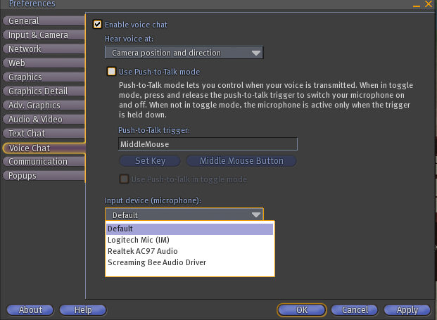 Second Life can use the system default microphone for audio input