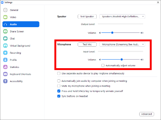 For Microphone Select "Screaming Bee Audio" in the drop down.