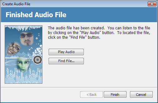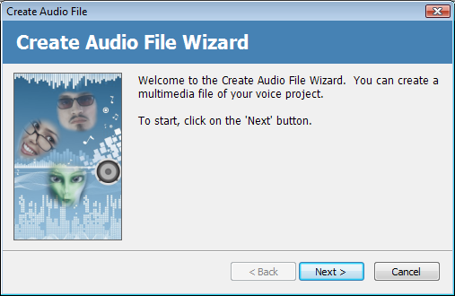 To launch the Create Audio File Wizard, Click on the "File>Create Audio File..." menu item.