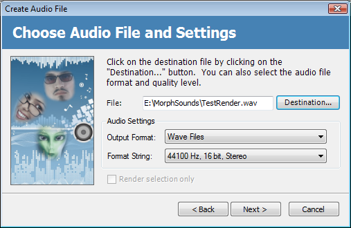 Next, choose the destination file that you would like to render your audio to. You can also choose the file format (*.WAV, *.OGG, *.WMA) as well as the audio quality settings for a given file format.