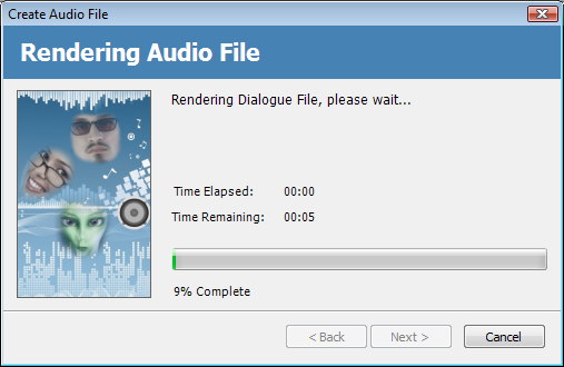 You can create a dialogue file by using the Create Audio File Wizard. This wizard walks you through the steps for rendering an audio file